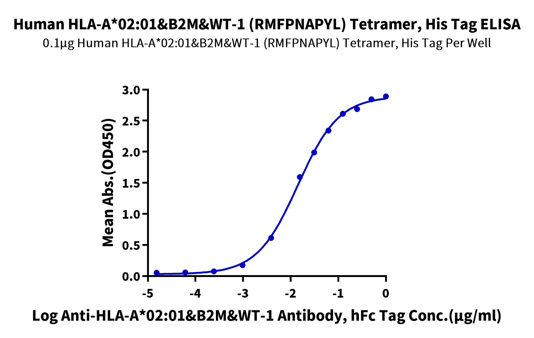 Recombinant Human HLA-A*02:01&B2M&WT-1 (RMFPNAPYL) Tetramer Protein is expressed from HEK293 with His tag and Avi tag at the C-Terminus,tetramer is assembled by biotinylated monomer and streptavidin.It contains Gly25-Thr305(HLA-A*02:01), Ile21-Met119(B2M) and RMFPNAPYL peptide [Accession | A0A140T913(HLA-A*02:01)&P61769(B2M)&RMFPNAPYL].