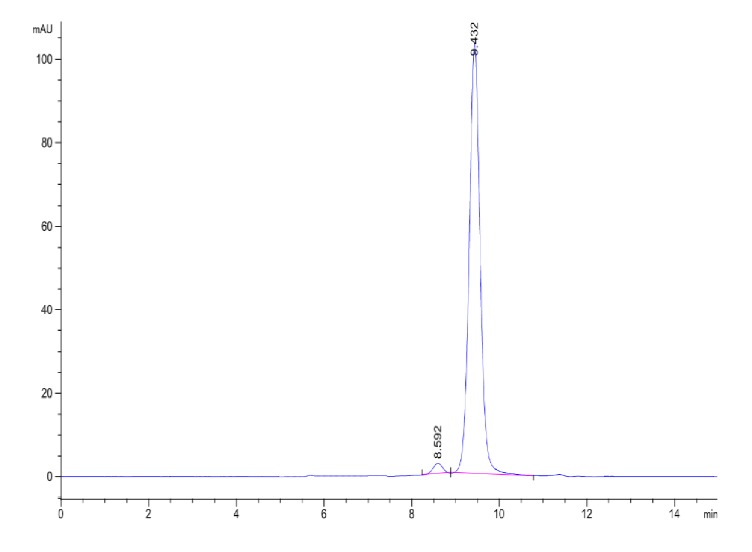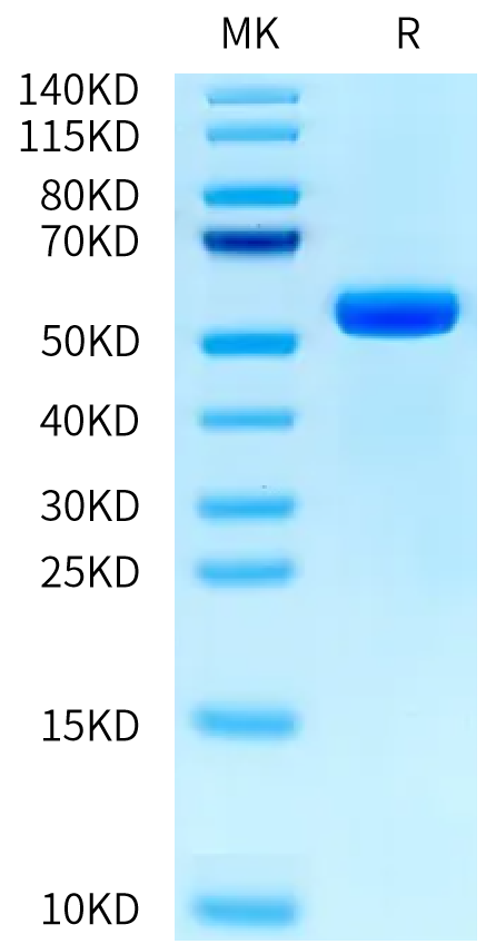 The protein has a predicted MW of 48.6 kDa. Due to glycosylation, the protein migrates to 50-60 kDa based on Bis-Tris PAGE result.