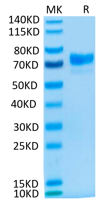The protein has a predicted MW of 58.6 kDa. Due to glycosylation, the protein migrates to 70-80 kDa based on Bis-Tris PAGE result.
