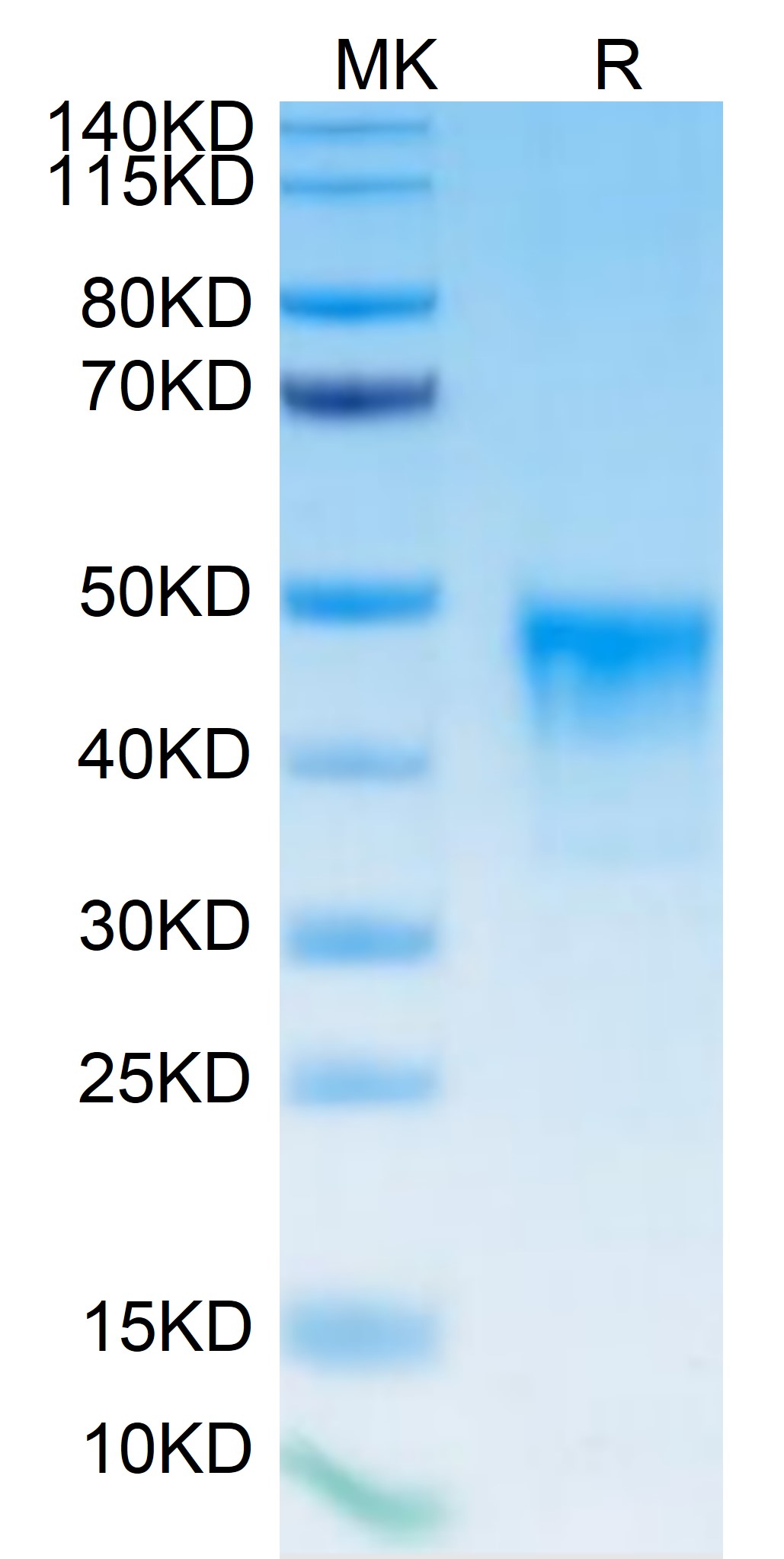 The protein has a predicted MW of 35.2 kDa. Due to glycosylation, the protein migrates to 40-50 kDa based on Bis-Tris PAGE result.