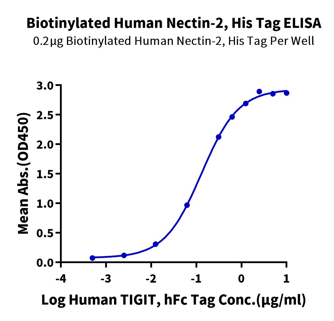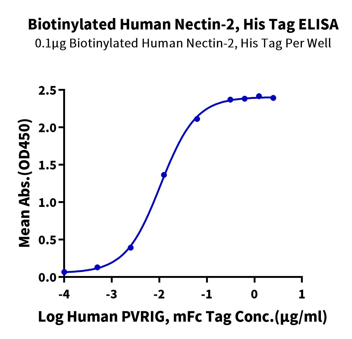 Recombinant Biotinylated Human Nectin-2/CD112 Protein is expressed from HEK293 with His tag and Avi tag at the C-Terminus.It contains Gln32-Leu360 [Accession | Q92692-2].
