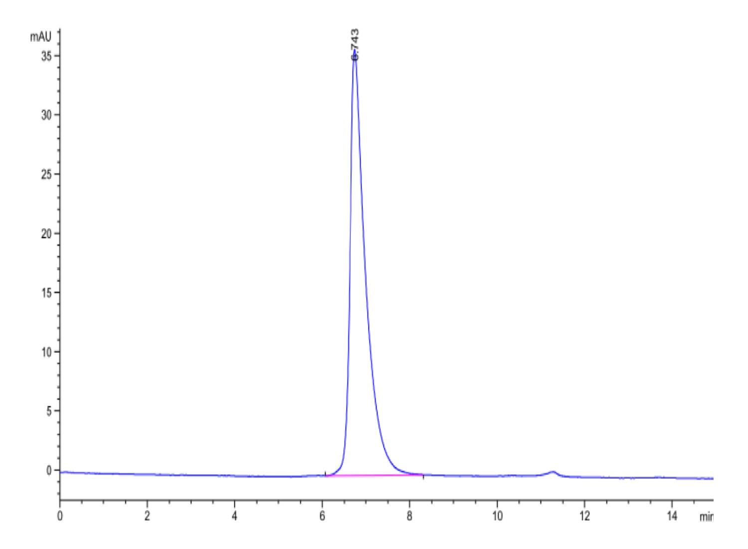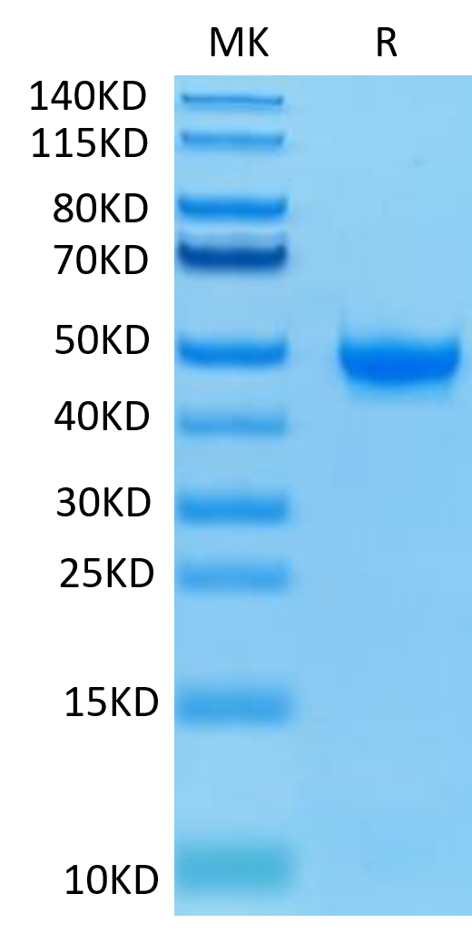 The protein has a predicted MW of 38.4 kDa. Due to glycosylation, the protein migrates to 45-50 kDa based on Bis-Tris PAGE result.