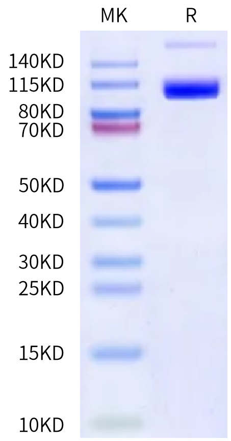 The protein has a predicted MW of 80.6 kDa. Due to glycosylation, the protein migrates to 90-110 kDa based on Bis-Tris PAGE result.