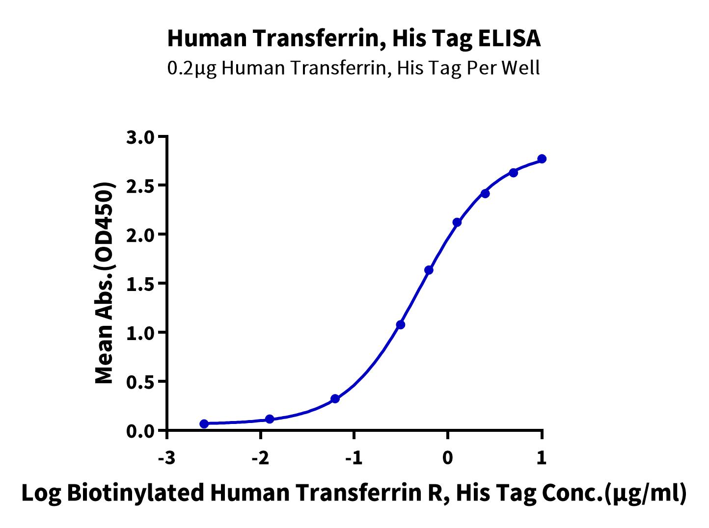 Immobilized Human Transferrin, His Tag at 2μg/ml (100μl/well) on the plate. Dose response curve for Biotinylated Human Transferrin R, His Tag with the EC50 of 0.50μg/ml determined by ELISA (QC Test).