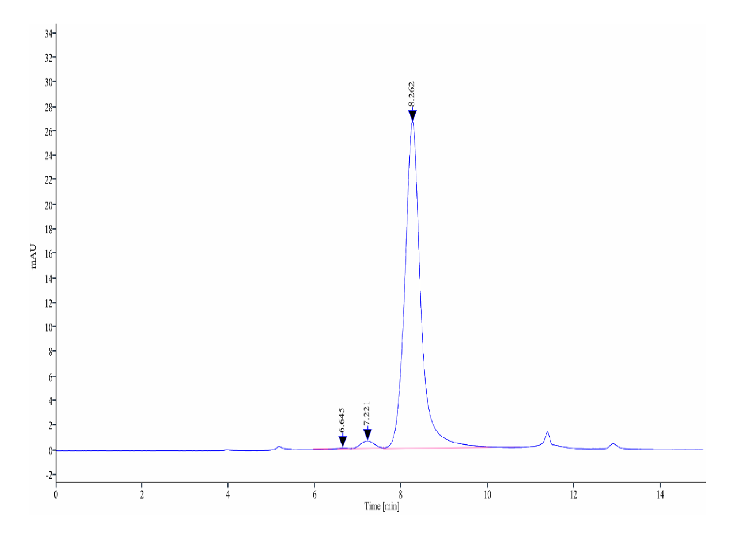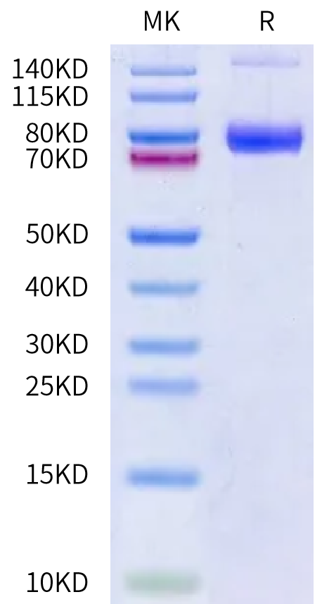 The protein has a predicted MW of 76.3 kDa. Due to glycosylation, the protein migrates to 78-90 kDa based on Bis-Tris PAGE result.