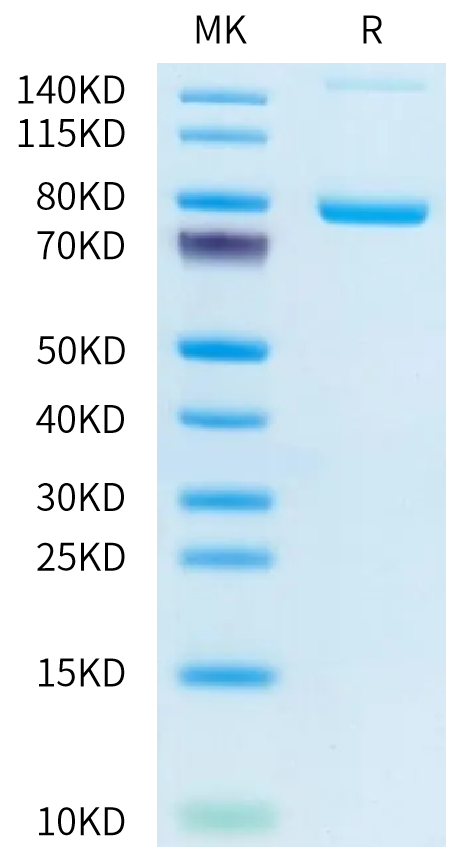 The protein has a predicted MW of 77.9 kDa. Due to glycosylation, the protein migrates to 78-85 kDa based on Bis-Tris PAGE result.