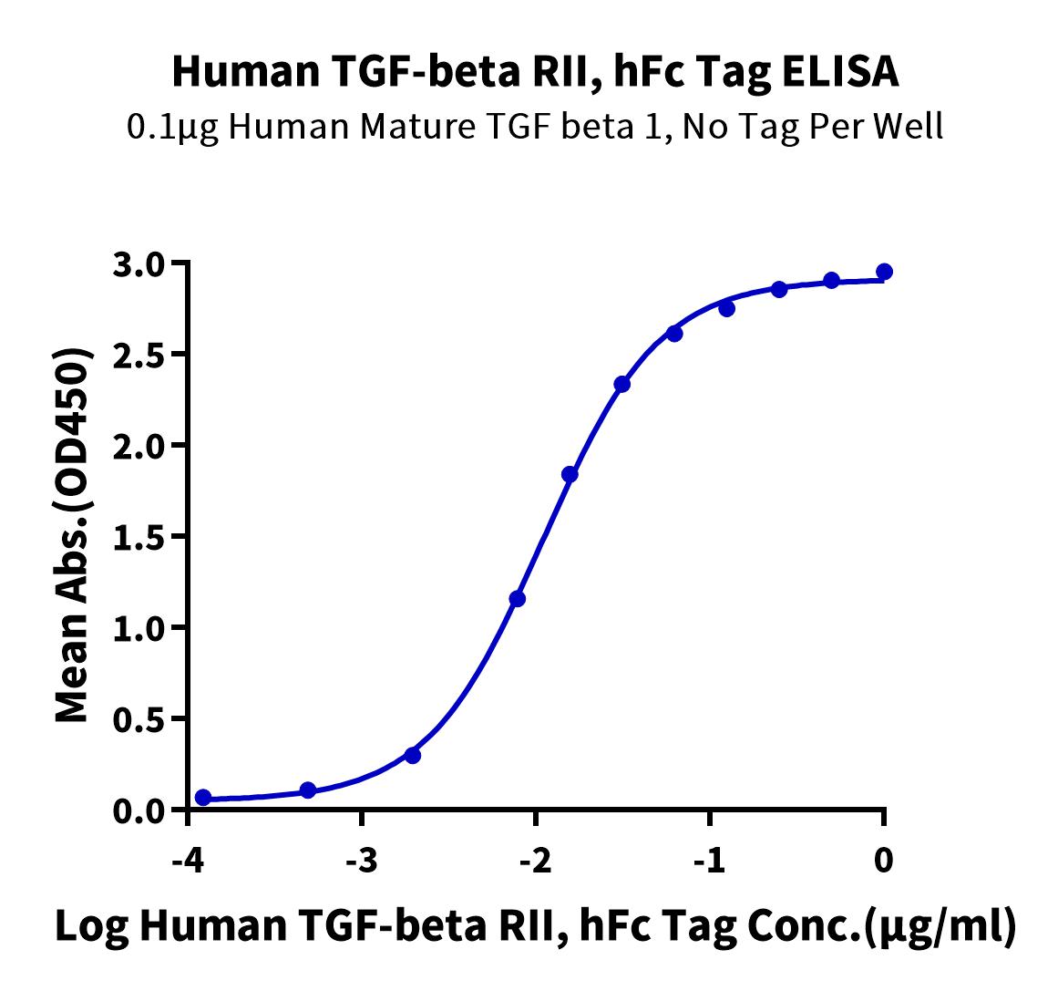 Recombinant Human TGF-beta RII/TGFBR2 Protein is expressed from HEK293 with hFc tag at the N-Terminus.It contains Ile24-Asp159 [Accession | P37173-1].